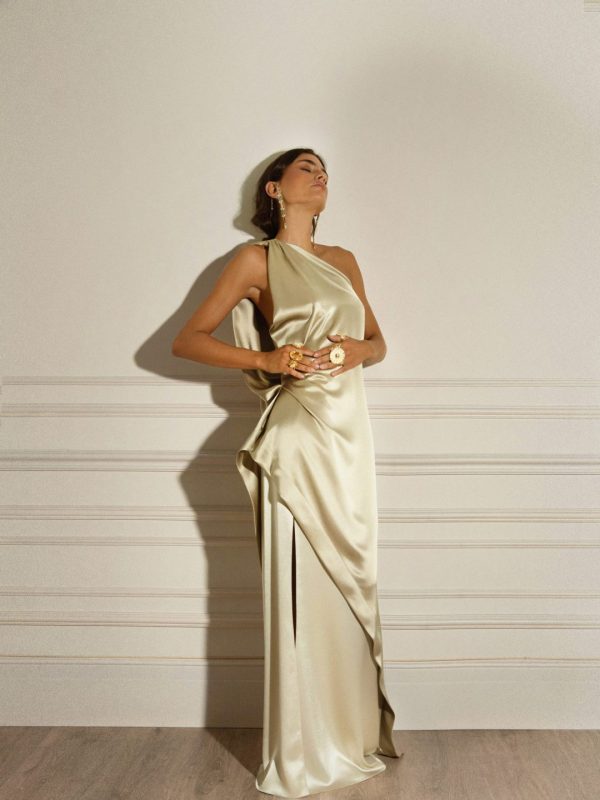 This long top is a unique and elegant piece that combines sophistication and comfort. Its asymmetric design, with a single sleeve and flowing side draping, creates a flattering silhouette and adds a touch of movement. The triacetate fabric, with its soft drape and subtle sheen, adds a luxurious and sophisticated look. The dark green-gold colour gives it a mysterious and elegant air.