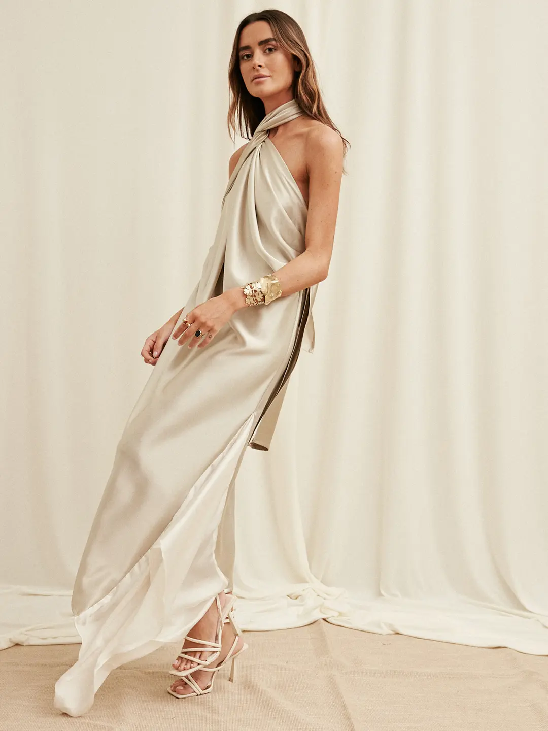 Elegant halter-neck guest dress with side draping and a seductive open back, crafted in luxurious silk satin. A creation that fuses glamour with sophistication to stand out on any special occasion.