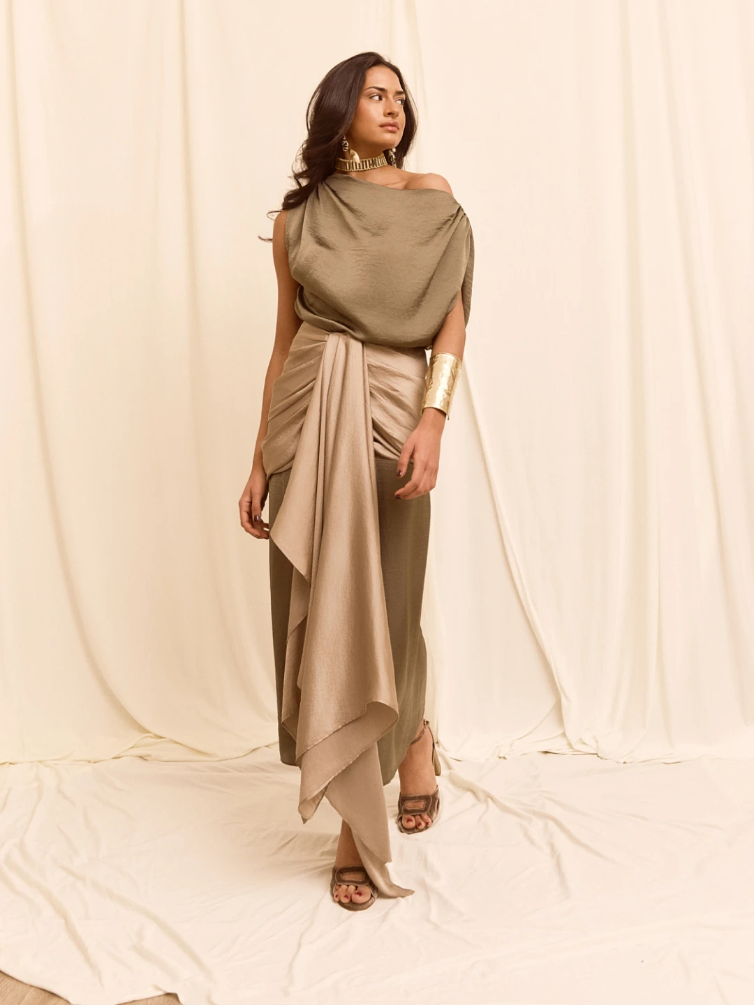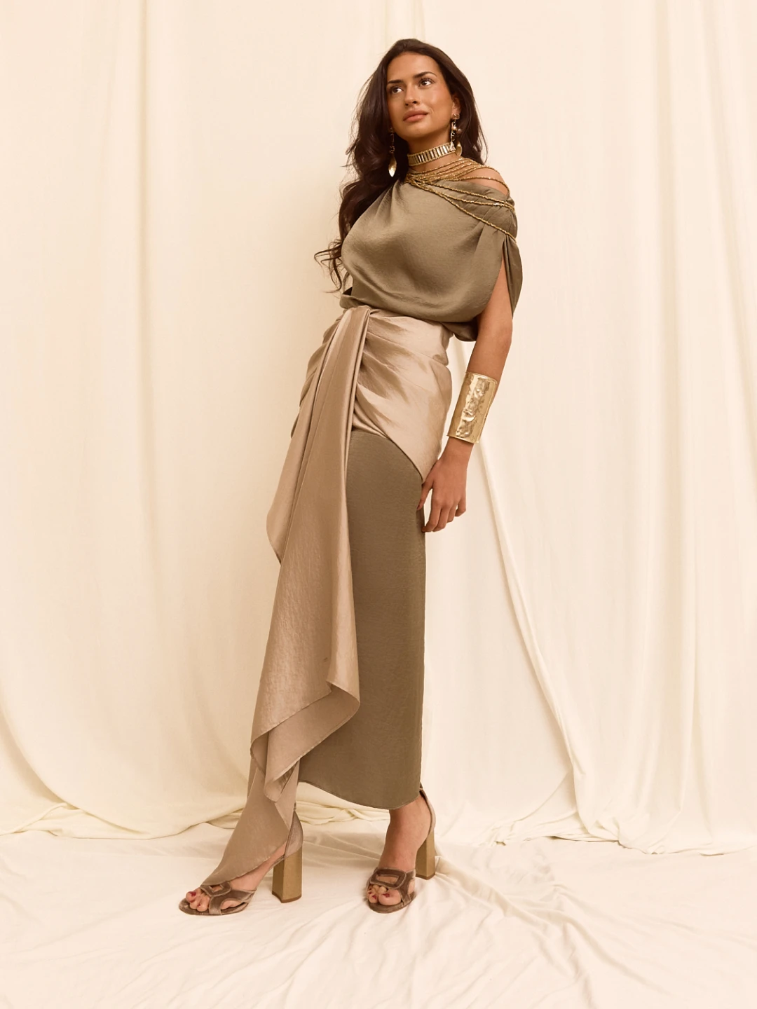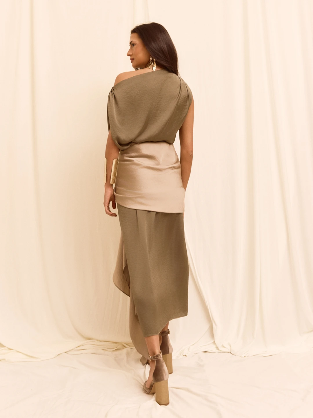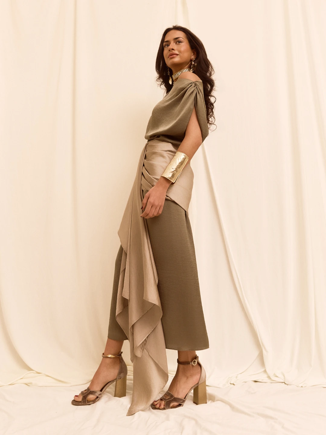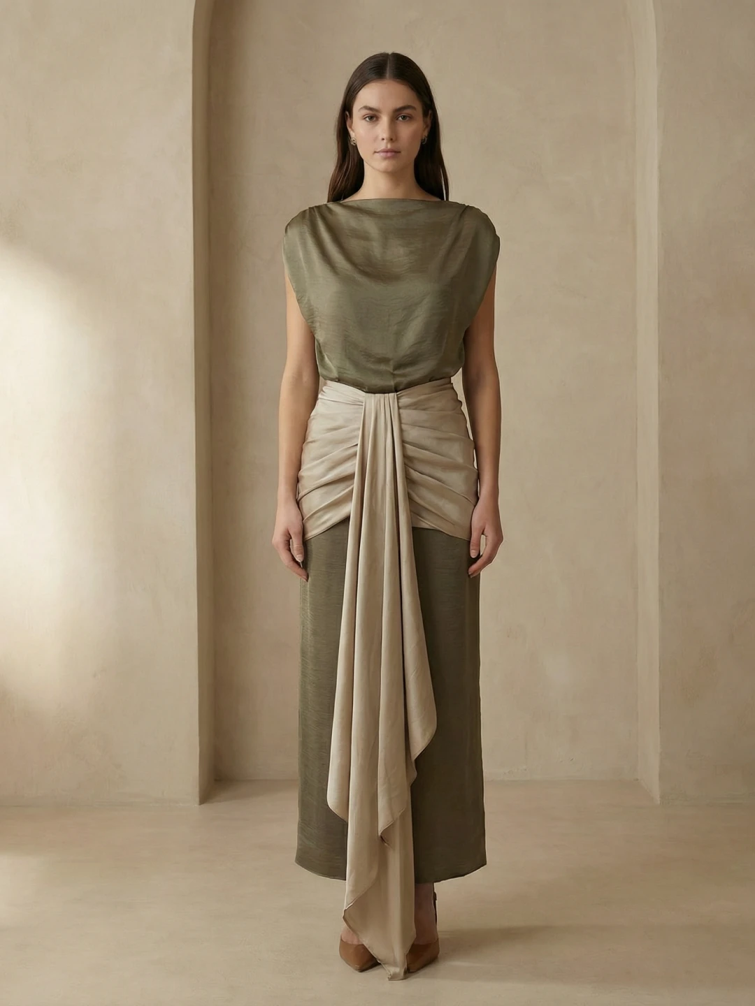 Falda de talle alto y corte recto, confeccionada en color verde, que estiliza la silueta con una seductora abertura en el centro. Presenta elegantes drapeados en la cintura y la cadera, que aportan movimiento y sofisticación, y se realza con una delicada aplicación de pañuelo gris, creando un contraste sutil y elegante.