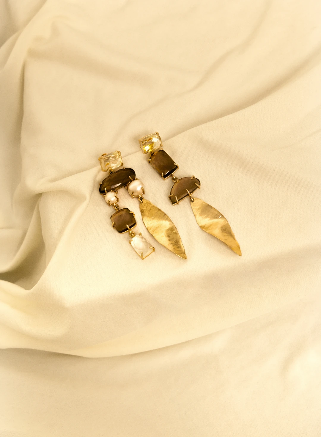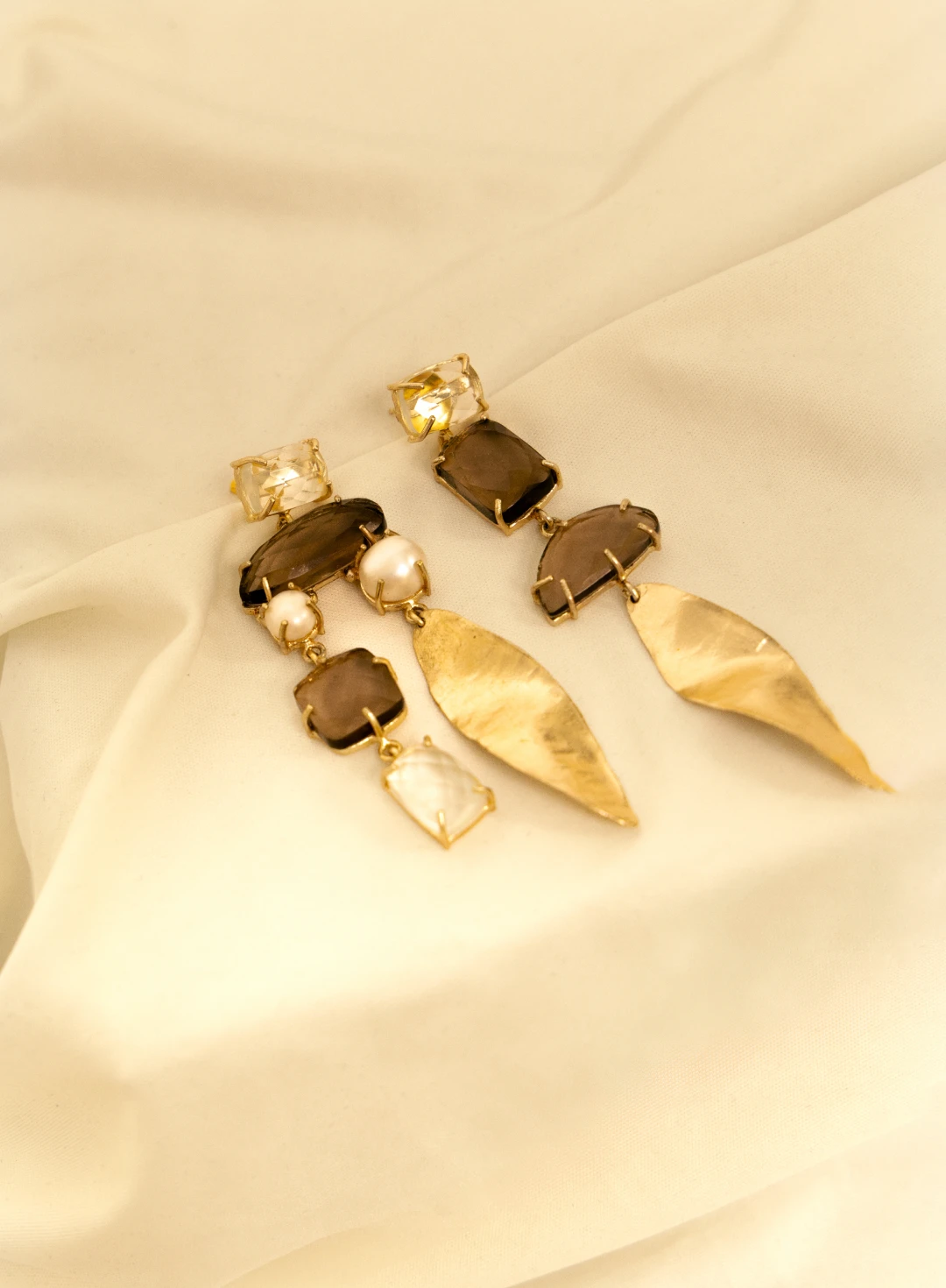 Pendientes con base en latón y piedras preciosas y perlas en tonos neutros, 10 cm de largo.