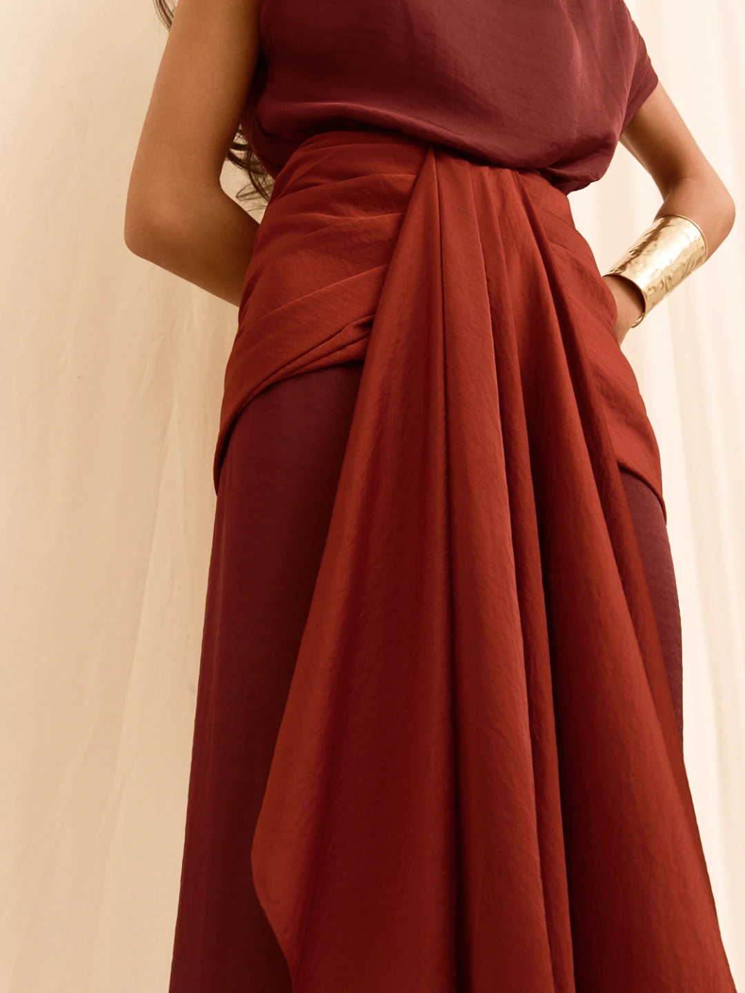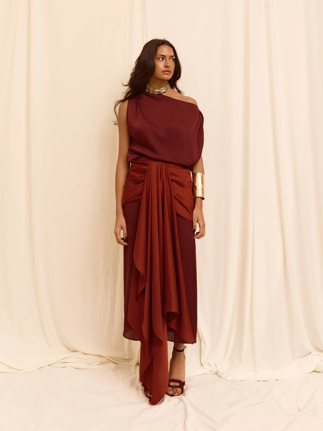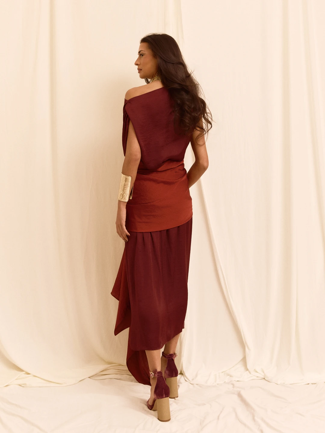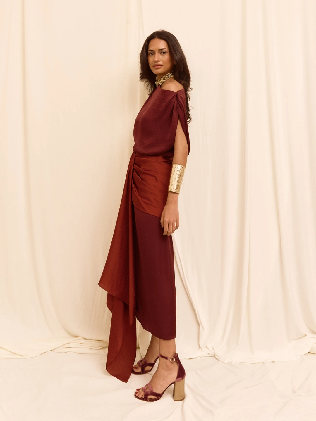 cae con elegancia y realza la figura. El detalle de la manga caída le aporta un toque de originalidad y delicadeza. El color granate le da profundidad y versatilidad, convirtiéndolo en una pieza ideal para distintas ocasiones.